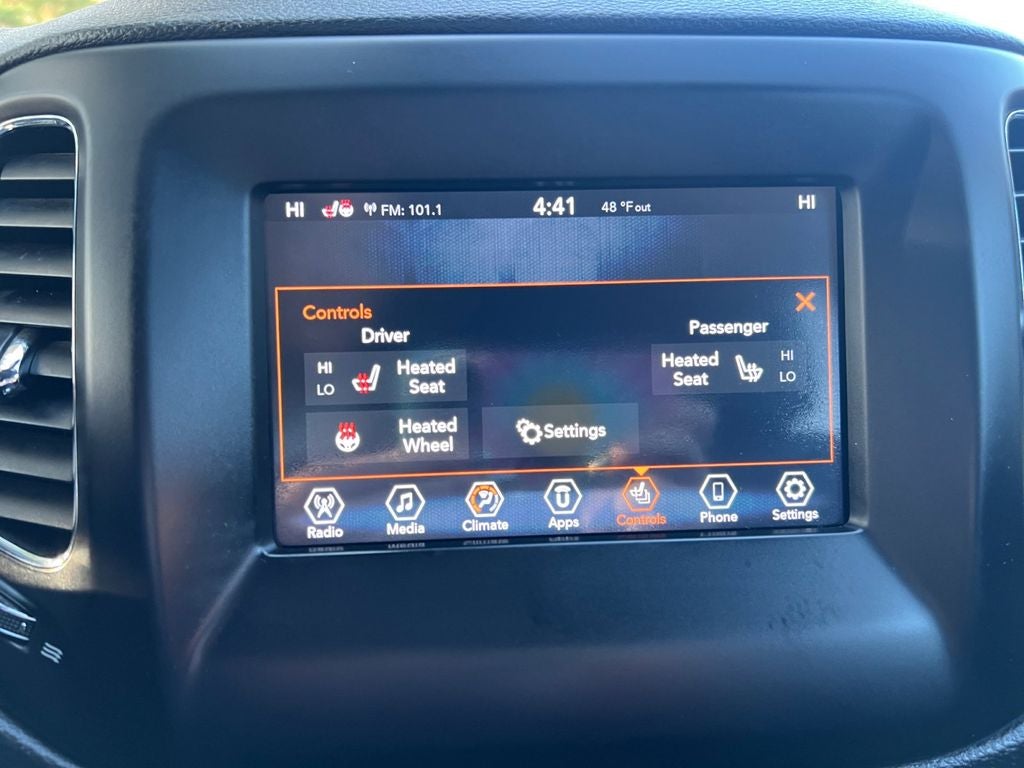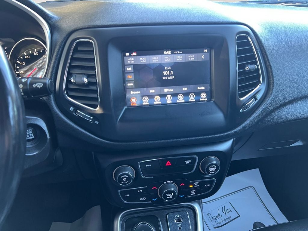 - The 2019 Jeep Compass Latitude 4x4 offers a perfect balance of capability, comfort, and modern technology, making it a great choice for both daily driving and weekend adventures. Finished in a clean White Clear-Coat exterior with a sleek Black interior, this Compass delivers a sharp, versatile look inside and out. Under the hood, it’s powered by a 2.4L I4 MultiAir engine paired with a smooth 9-speed automatic transmission, providing confident performance and efficiency. With Jeep’s Selec-Terrain® system and 4x4 capability, you’ll be ready to take on changing road conditions with ease. Inside, the cabin is thoughtfully designed with premium cloth and vinyl bucket seats, a leather-wrapped steering wheel, and dual-zone automatic climate control to keep everyone comfortable. The Uconnect® 4 system with a 7-inch display keeps you connected with Apple CarPlay®, Android Auto™, Bluetooth® streaming audio, and SiriusXM® capability, all easily controlled through steering wheel-mounted controls. Safety and convenience come standard with features like a ParkView® rear back-up camera, push-button start, remote proximity keyless entry, and advanced airbag systems. Additional highlights include ambient LED interior lighting, a 60/40 split-folding rear seat for added cargo flexibility, and multiple power outlets and USB ports to keep your devices charged on the go. This Compass is also equipped with the Cold Weather Group, adding heated front seats, a heated steering wheel, remote start, and a windshield wiper de-icer—perfect for handling Michigan winters. The two-tone gloss black roof adds a bold, stylish touch that helps this SUV stand out on the road. With its combination of capability, technology, and comfort-focused features, this 2019 Jeep Compass Latitude 4x4 is ready to fit seamlessly into your lifestyle.